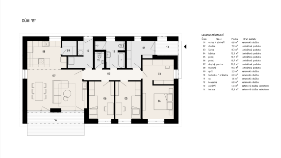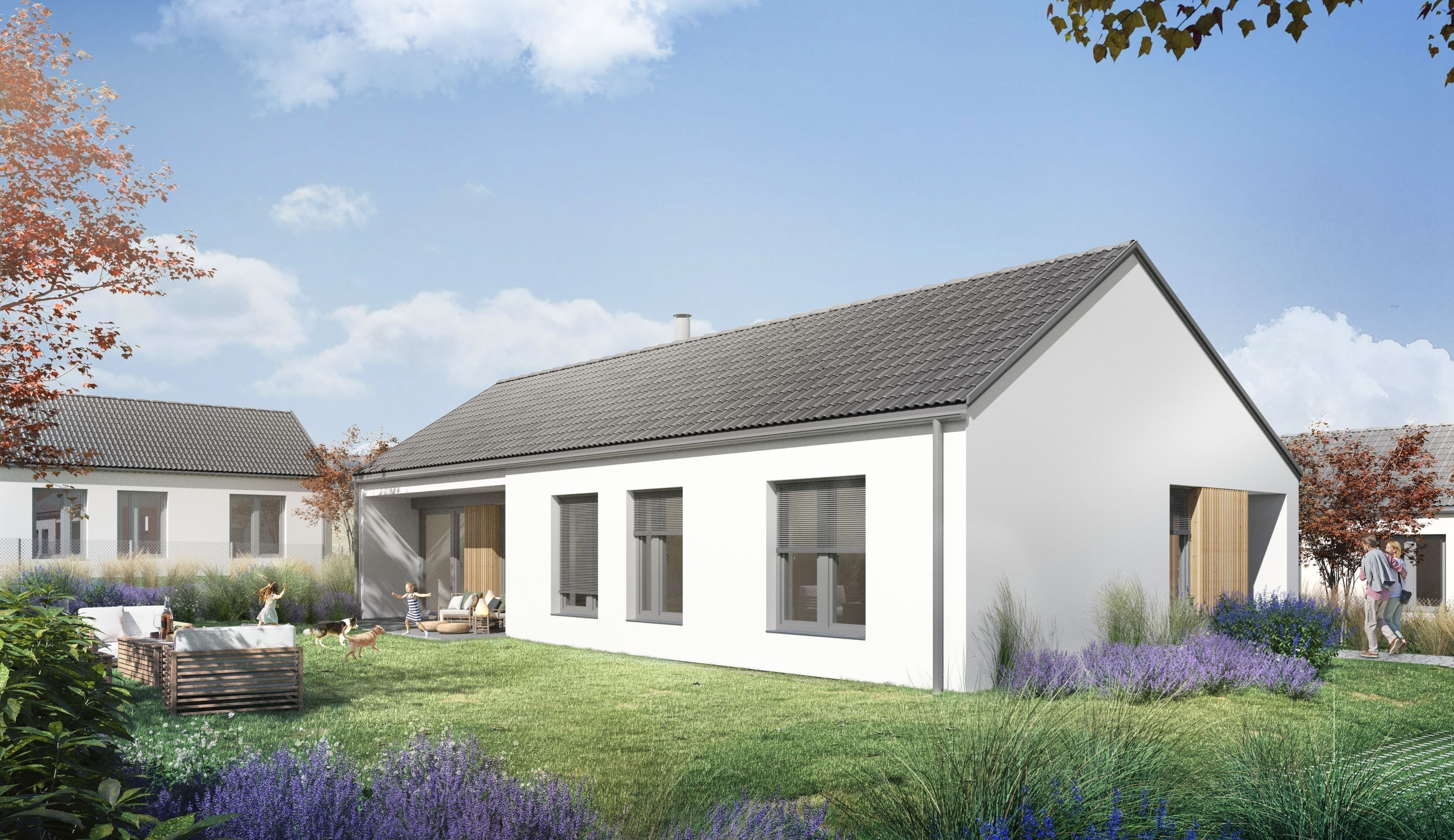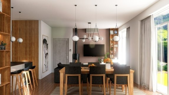 Obálka objektů je z hlediska energetického posouzení navržena ve třídě "B - velmi úsporná", což spolu s vytápěním splitovým tepelným čerpadlem vzduch-voda a krbovými kamny jako doplňkovým zdrojem tepla zajistí dlouhodobý uživatelský komfort. Ten je ještě podpořen podlahovým vytápěním ve všech obytných místnostech a přípravou pro osazení venkovních hliníkových žaluzií nad okny zasklenými izolačním trojsklem. Povrchová úprava nosných stěn i vnitřních zděných příček je většinově řešena omítkami (štukovými v interiéru, jemnozrnnou v exteriéru), místy je vnější plášť ozvláštněn užitím laťového obkladu z odolného modřínového dřeva.