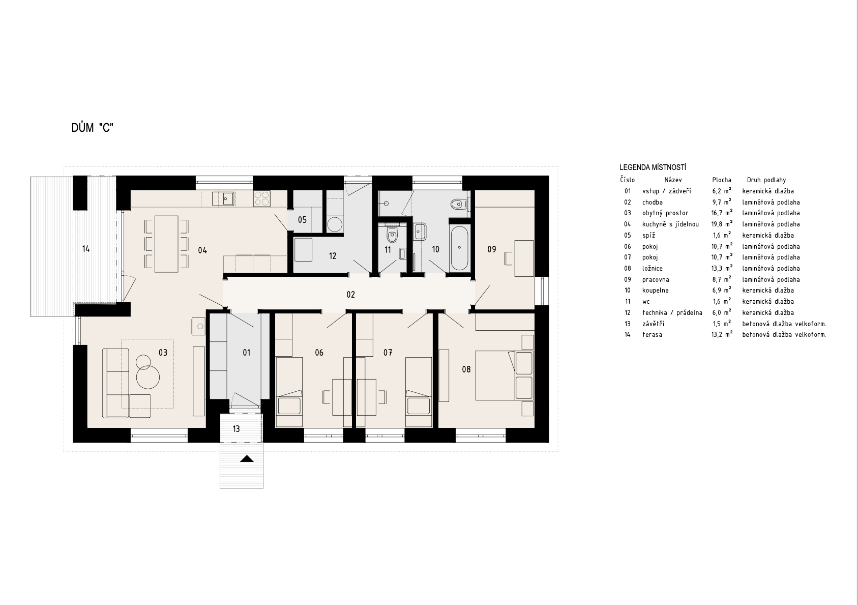 Obálka objektů je z hlediska energetického posouzení navržena ve třídě "B - velmi úsporná", což spolu s vytápěním splitovým tepelným čerpadlem vzduch-voda a krbovými kamny jako doplňkovým zdrojem tepla zajistí dlouhodobý uživatelský komfort. Ten je ještě podpořen podlahovým vytápěním ve všech obytných místnostech a přípravou pro osazení venkovních hliníkových žaluzií nad okny zasklenými izolačním trojsklem. Povrchová úprava nosných stěn i vnitřních zděných příček je většinově řešena omítkami (štukovými v interiéru, jemnozrnnou v exteriéru), místy je vnější plášť ozvláštněn užitím laťového obkladu z odolného modřínového dřeva.